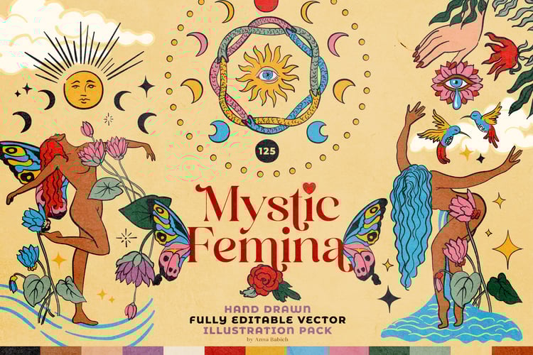 Step into the sacred world of Mystic Femina — a hand-drawn clipart collection celebrating the divine feminine, intuition, and inner transformation. Over 125 mystical elements crafted with soul and symbolism.