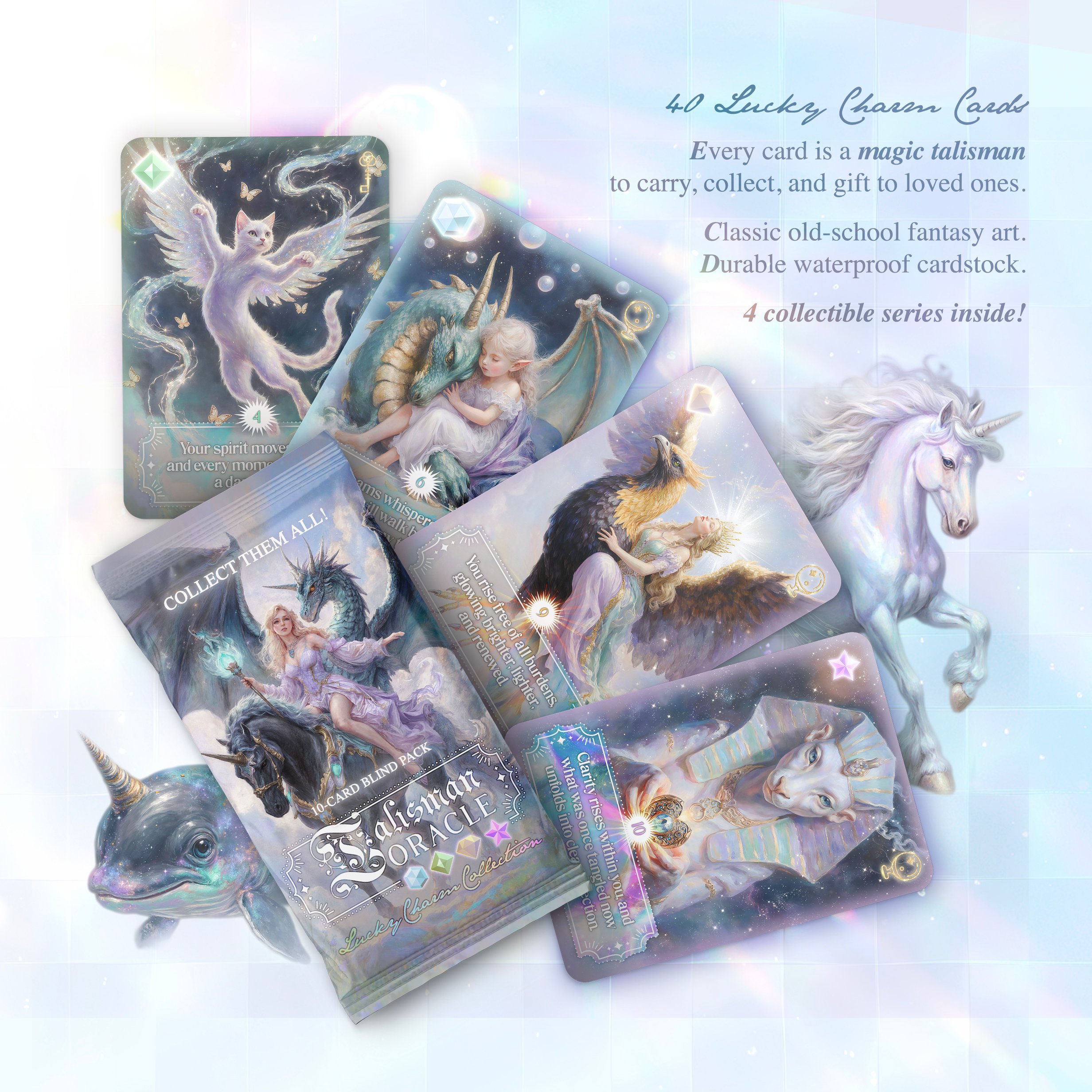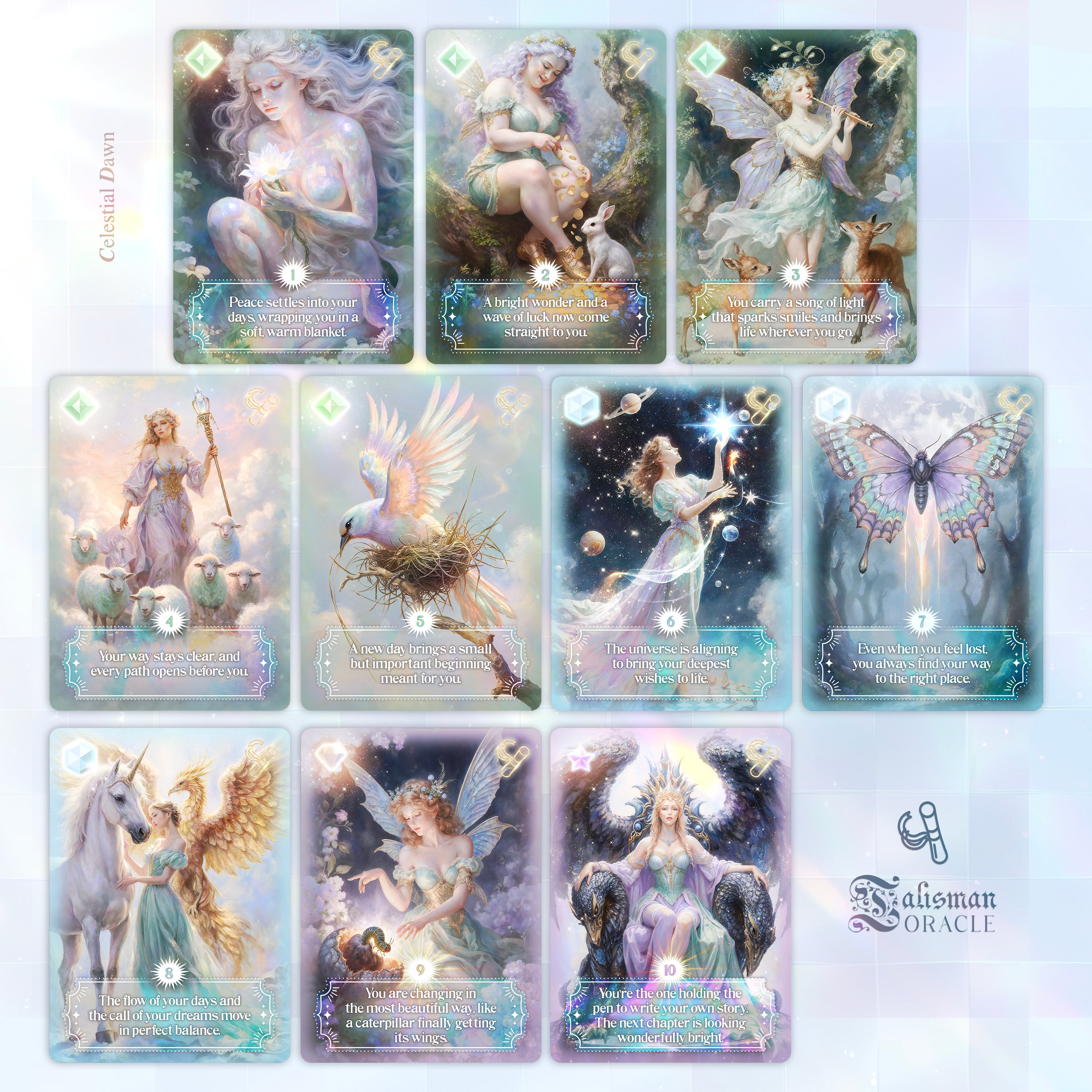 The Talisman Oracle Cards — a magical 40-card collection of lucky charm oracles, each infused with light, fortune, and timeless fantasy art. More than a deck, it’s a world of blessings and charm — every card a personal talisman carrying a spark of luck and protection.