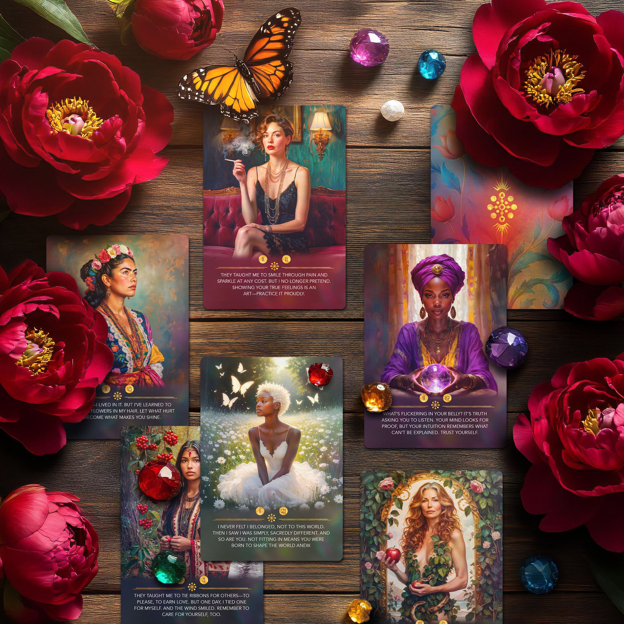 Foremothers Oracle Deck — a 60-card oracle featuring women of all ages, times, and cultures. Each vibrant portrait is a doorway to ancestral wisdom — from fearless girls to silver-haired elders. Use these cards as daily guidance, for altar work, or to reconnect with the feminine strength within you. Perfect for those drawn to ancestral healing, shadow work, and self-love. A sacred circle of foremothers to remind you of your power and light.